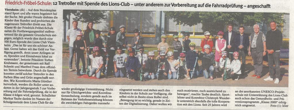 Die Kinder der Klasse 4b der Friedrich-Fröbel-Schule strahlten um die Wette, als sie als erstes die 12 neuen Tretroller einweihen durften. Dank einer Spende des Lions-Clubs Viernheim in Höhe von 500.- wurden die Roller von den Kindern gleich auf dem Schulhof ausgetestet.